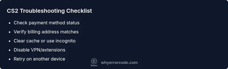 CS2 signals a verification hold affecting checkout or sign-in. It’s triggered by payment or identity checks and requires action to restore access. Following a structured troubleshooting flow usually resolves it.