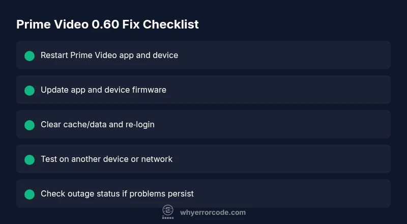 When you see the 0.60 code, it usually means Prime Video couldn't establish or sustain a smooth connection to the streaming servers during playback. This is not a single-root fault; it often points to network negotiation hiccups, an out-of-date app, or a temporary server-side hiccup. For those wondering how to fix error code 0.60 prime video, start from the simplest checks and move toward device-specific fixes. According to Why Error Code, most 0.60 issues are resolved by refreshing connections and re-authenticating where necessary. The goal is to restore a clean handshake between your device and Prime Video quickly.