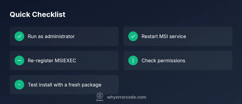 Quick fixes: run as admin, restart MSI service, re-register MSIEXEC, and check permissions.