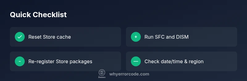 If you see multiple error codes that reference Store components, the root cause is often cache corruption or a corrupted package cache that affects the Windows AppX pipeline. This makes it important to start with non-destructive, reversible steps before deeper repairs.