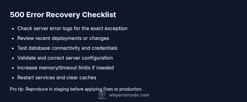 Urgent, practical guide to remove error code 500 (Internal Server Error). Learn fast checks, diagnose root causes, and apply safe fixes to restore service with minimal downtime. Includes step-by-step fixes, diagnostic flow, and when to call a professional.