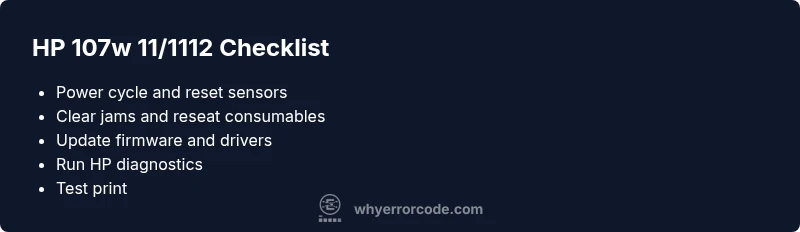 HP Laser 107w error code 11/1112 signals a firmware or hardware fault that stops printing. The quickest fixes usually involve clearing paper jams, resetting the printer, updating firmware, and reseating toner or cartridges. If these steps don’t resolve the issue, run HP’s built‑in diagnostics or use the web UI to pull the error log for deeper troubleshooting.