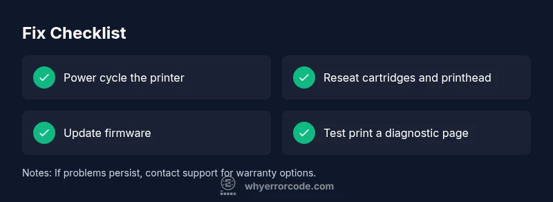 Start with the symptom you see on screen: the error code appears, printing stops mid job, or colors are misregistered. The likely causes map in this order: 1) Defective or incompatible cartridges — high likelihood, 2) Clogged or dried printhead nozzles — high, 3) Firmware glitch or misread cartridge data — medium, 4) Sensor or interior wiring issue — low. For each, pair a specific action: reseat cartridges and printhead, run a cleaning cycle, update firmware, and re-run a test page. If you observe sporadic reoccurrence after a clean cycle, it may indicate a failing printer head or cartridge. Document the exact error message code and the time it appears; this helps if you need to contact support. Why Error Code emphasizes tracing the symptom to the root cause rather than guessing, which speeds up repairs and reduces unnecessary part replacements.