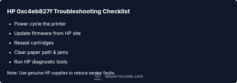The hp printer error code 0xc4eb827f signals a firmware or hardware fault that interrupts printing. The fastest path to a resolution is to power cycle the printer, update firmware, re-seat cartridges, and clear paper jams. If the issue persists, perform a factory reset or contact HP support for deeper diagnostics.