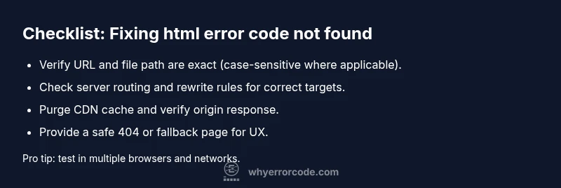 Urgent guide to diagnose and fix the 'html error code not found' across browsers and servers with practical fixes, diagnostics, and prevention tips for developers.