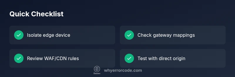 Bypass edge devices to locate the origin, review gateway mappings, and clear CDN caches. Adjust rules only where necessary, then retest with controlled requests.