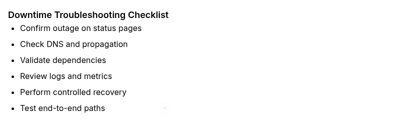 If uptime dashboards show an outage or you cannot make progress, contact your hosting provider or CDN vendor. They can confirm infrastructure-wide issues or regional outages and advise on mitigations.
