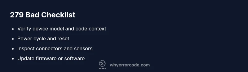 Is error code 279 bad typically signals a fault condition that interrupts operation. The specific meaning varies by device, but it often points to sensor, communication, or firmware issues that require diagnosis. Start with a safe reset and check connections before contacting support.