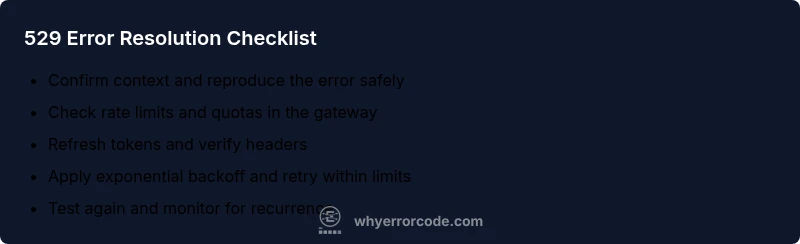 If you encounter this error, start with rapid, low-risk steps to regain momentum. First, reproduce under controlled conditions to confirm the context. Then implement exponential backoff on retry attempts and throttle to within documented limits. Check quotas or usage caps in the API gateway and verify that authentication tokens, headers, and endpoints are correct. Ensure your network path isn’t intermittently dropping packets or introducing proxies that could trigger a 529-like condition. If you’re in a team, alert the administrator and share your logs; often the problem is on the server side or a misconfiguration in the gateway. Finally, monitor for a short window after applying fixes to ensure the error does not recur. Understanding the phrase 'is error code 529 bad' in real scenarios helps you decide whether to retry, adjust, or escalate.