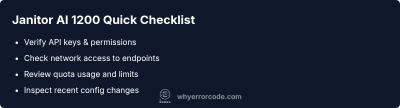 janitor ai error code 1200 signals a critical failure in the automation workflow, typically arising from connectivity, quota limits, or a misconfigured API. The most common quick fix is to verify the API credentials, confirm network access, and restart the affected service. If the issue persists, follow the detailed steps below to diagnose and repair the underlying cause.