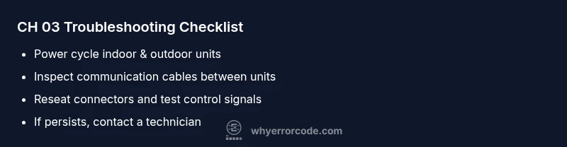 The moment you see CH 03, start with a logical flow to isolate the fault. Symptoms point to a link problem; possible causes include a loose or damaged communication cable, a faulty control board in the outdoor unit, or a transient power fluctuation that briefly disrupted data links. Quick fixes emphasize safe, manual checks before deeper diagnostics. If the issue persists after reseating cables and performing a system reset, plan a professional diagnostic to test boards and firmware integrity. This flow helps you prioritize fixes in order of likelihood and safety.