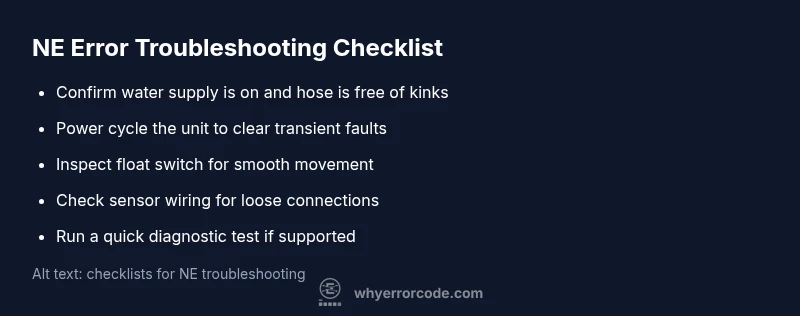LG dishwasher error code NE signals a fault tied to water level sensing or sensor readings. Try a quick reset, verify the water supply is on and unobstructed, and inspect the sensor harness for damage or buildup. If the code persists, follow the diagnostic flow or consult Why Error Code for deeper guidance.