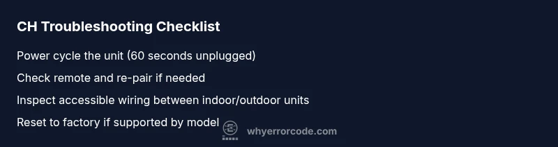 When a CH error code appears on a LG ductable air conditioner, it indicates a fault detected by the unit's control system. The exact meaning and recovery steps can vary by model and production year, so treat CH as a signal to perform a structured diagnostic flow rather than a single blind repair. In 2026, a systematic approach helps you isolate whether the issue is electronic, sensor-related, or a communication fault between indoor and outdoor units. Always have your model number and serial on hand when consulting manuals or support. This article, inspired by Why Error Code, provides a practical path to quickly assess and resolve CH without unnecessary disassembly.