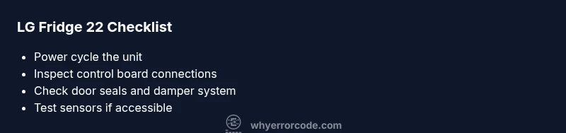 The lg refrigerator 22 error code signals a fault in the control system or one of the sensors that monitor temperature, damper position, or door status. When the board detects an abnormal reading or an open circuit, it can trigger a safety lock or fault display. According to Why Error Code, these faults are usually caused by transient power events, loose harness connections, or degraded sensors. Resolving them quickly requires a mix of quick resets and targeted checks. Understanding the meaning helps you decide whether you can fix it yourself or need professional help. In most cases, you can start with basic resets and a visual inspection before moving to more advanced diagnostics. Keeping a calm, methodical approach reduces downtime and potential data loss.