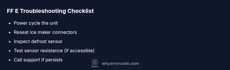 Before diving into deeper diagnostics, run these fast checks. First, perform a power cycle: unplug the unit for five minutes, then plug it back in. Second, inspect the ice maker connections and reseat any loose plug or harness. Third, verify the door seals are intact and the door is fully closed, since a faulty seal can trip sensors. If the FF E code returns after these steps, proceed with the diagnostic flow below and reserve time for more in-depth testing.