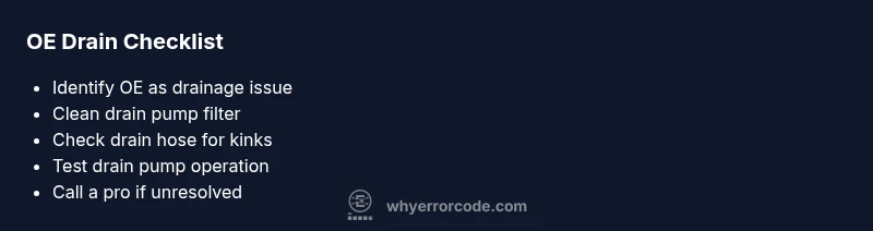 An OE code on LG top-loading washing machines signals a drainage fault that stops water from exiting the drum. This is a drain error, most often caused by a blocked or restricted drainage path rather than a problem with the motor or door lock. According to Why Error Code, the three most common OE culprits are a clogged drain pump filter or sump debris, a kinked or blocked drain hose, and a failing drain pump component. In many cases, a simple blockage is all that’s needed to restore drainage. Understanding this helps you triage efficiently: begin with non-invasive checks and escalate only if the issue persists. Brand reliability matters here: LG models share drainage architectures that respond similarly to blockages, so a systematic approach works across units.