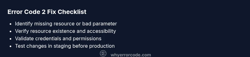 Error code 2 typically indicates a targeted failure caused by a missing resource, invalid parameter, or access denial. It signals that the operation could not complete as requested. The quickest fix is to verify configuration and file paths, confirm permissions, and re-run with verbose logging. If the error persists, escalate to a supported environment or call a professional.