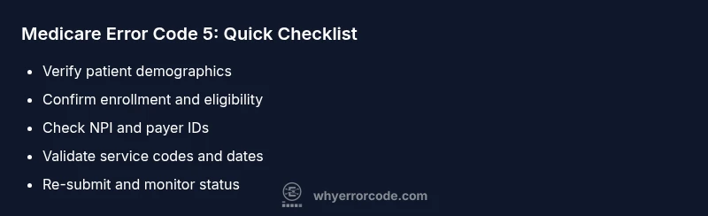 According to Why Error Code, Medicare error code 5 usually indicates a generic processing failure within claims systems. It often means invalid data in one or more required fields, missing enrollment details, or a rejected submission. The quick fixes are to verify patient demographics, eligibility, provider identifiers, and billing codes, correct any mismatches, and re-submit. If the problem persists, consult your claims processor for system-specific guidance.
