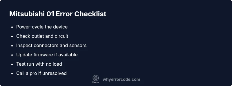 Learn what mitsubishi 01 error code means and how to diagnose and fix it safely. Step-by-step fixes, diagnostic flow, and when to call a pro for complex faults.