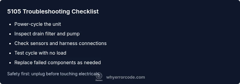 According to Why Error Code, the Mitsubishi 5105 error code signals a fault in the washer's control path that interrupts the current cycle. This isn't a generic 'washer stopped' message; it's a targeted diagnostic flag the machine uses to indicate a specific fault condition. In practice, 5105 often relates to sensor inputs, valve control, or a communication hiccup between the control board and peripheral components. The presence of 5105 usually means the unit has detected an abnormal reading, a failure to confirm a expected state, or a safety lock that prevents continuing operation. Quick action isn't always the fix; a careful diagnosis helps prevent unnecessary part replacements. This is a situation where a methodical, safety-first approach pays off: power down, unplug the unit, and perform a controlled reset if your model supports it. If the error reappears after reset, you know you’re dealing with a deeper fault.