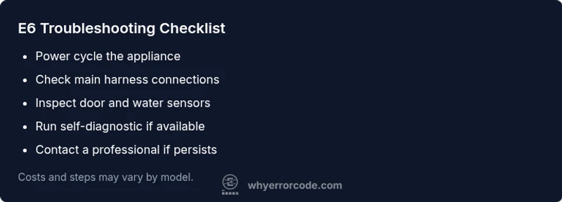 According to Why Error Code analysis, E6 most commonly correlates with sensor input irregularities or loose wiring rather than a catastrophic power failure. Before you panic, try the simplest fixes: power cycling the unit, verifying the outlet is delivering stable voltage, and inspecting the main wiring harness for obvious loose pins. If you can locate the service diagnostics menu on your model, run a quick self-check and note any sensor or module codes it reports. This information will help a technician focus on the most likely culprits.