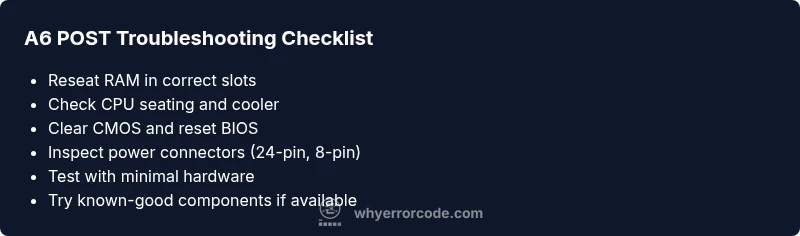 - A6 often points to RAM/CPU seating or power delivery; test methodically