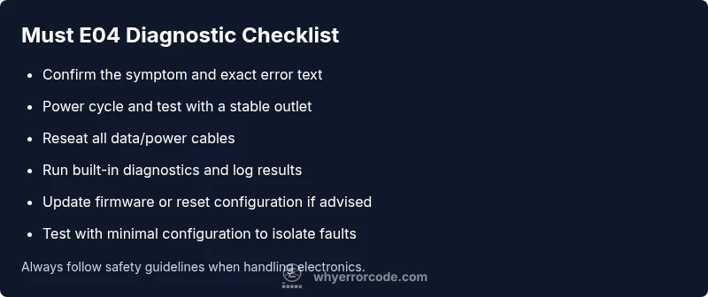 According to Why Error Code Team, must error code 04 signals a critical fault that interrupts normal operation and demands immediate attention. It usually points to a failed component or data path, triggering a defensive shutdown. In practice, this code appears across devices—from industrial controllers to consumer appliances—whenever the system detects unsafe conditions or inconsistent input data. The fastest way to respond is to treat E04 as non-negotiable: stop further operation, isolate the fault area, and begin a structured diagnostic flow. The goal is to verify electrical integrity, check for obvious physical faults, and rule out simple user-caused issues before diving into deeper repairs. Do not ignore the warning: unresolved E04 can lead to data loss, equipment damage, or safety hazards. In this guide, you’ll learn the quickest, safest path to identify the root cause and decide whether a quick fix suffices or a professional diagnostic is needed.