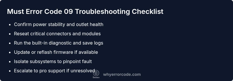 Urgent guide to diagnosing and fixing must error code 09. Learn a clear diagnostic flow, quick fixes, step-by-step repairs, and prevention tips for developers, IT pros, and everyday users.