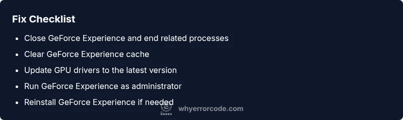 - Restart the GeForce Experience service and reboot the PC to clear transient states.