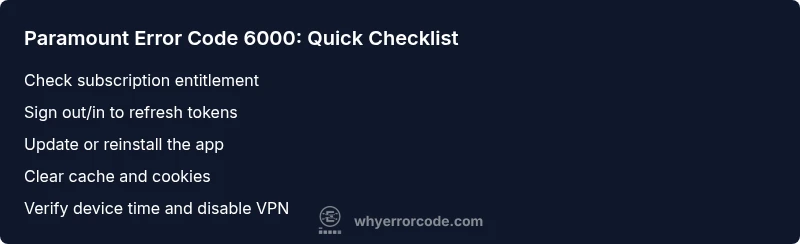 paramount error code 6000 indicates an entitlement/authentication issue that blocks playback. Start by verifying your subscription, signing out and back in, and refreshing the network. If needed, update or reinstall the Paramount app, clear the cache, and ensure the device time is correct and VPNs are disabled for faster restoration.