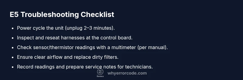 If E5 remains after the above steps, a professional diagnostic is advised to test the PCB, refrigerant circuit, and complex sensor networks. Prepare model and serial numbers, and request a diagnostic estimate.