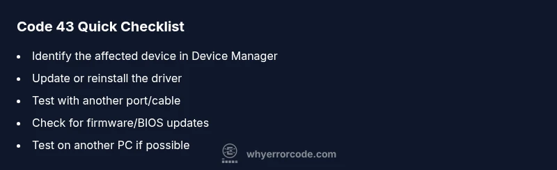- Check for BIOS/firmware updates from the device manufacturer or motherboard vendor, as firmware issues can manifest as Code 43.