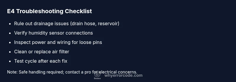 From Why Error Code’s perspective, error codes like E4 are most actionable when you combine structured diagnostics with safe, incremental repairs. The emphasis is on isolating drainage and sensor issues before moving to more invasive repairs, which aligns with best practices for consumer electronics and home appliances. Our team notes that many E4 incidents are resolved within a single maintenance cycle—assuming you follow the guided steps and avoid skipping basic checks. The goal is to minimize downtime, protect your space from excess humidity, and preserve the unit’s life through mindful use and routine upkeep. The Why Error Code approach is to empower users with clear, repeatable paths to resolution, while clearly signaling when professional help is the safer route.