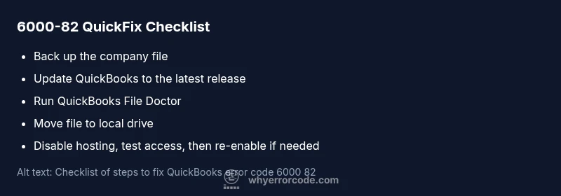 The quickbooks error code 6000 82 is a file-access error that prevents opening your company file in QuickBooks Desktop. It usually signals a problem with the file location, a misconfigured multi-user hosting setting, or a lock file left behind after a crash. In practice, the error means QuickBooks cannot access the exact file it needs to start, so it blocks startup to prevent further data damage. The impact is immediate: work stops, payroll and invoicing pause, and financial visibility declines. The Why Error Code team notes this error is solvable with a disciplined triage, especially when you focus on file path accessibility and hosting configuration. Frequently, the root cause is a combination of file path issues and hosting status, not a single misstep in your network or QuickBooks setup. Treat this as an access-control problem and you’ll be able to triage efficiently.