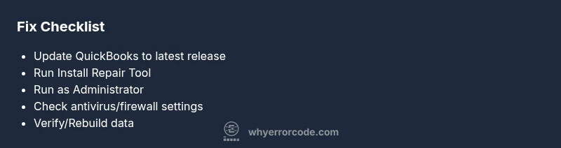 - Close QuickBooks and all related processes. 2) Run the QuickBooks Install Repair Tool from your program list or the Intuit support site. 3) Reboot the computer and launch QuickBooks again, selecting Run as Administrator. 4) Update QuickBooks to the latest release via Help > Update QuickBooks. 5) If the error persists, perform a clean reinstall, ensuring you back up data first. 6) After reinstall, re-run updates and verify settings. 7) Ensure antivirus or firewall is not blocking QuickBooks, and add exceptions if needed. 8) For multi-user setups, confirm network drive permissions. Pro-tip: keep a current backup before major changes.