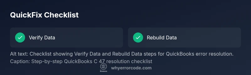 According to Why Error Code, quickbooks error code c 47 signals a data integrity or connectivity issue between QuickBooks and external services. The fastest relief usually comes from verifying data integrity, rebuilding the company file, and restoring a stable network connection. This quick guide outlines a practical diagnostic flow, quick fixes, and a safe step-by-step repair to get you back to work quickly. Keep this guide handy for future outages and share with teammates today.