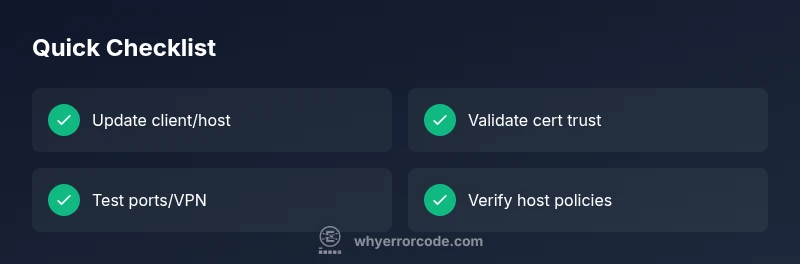 Yes, start with updating software, verifying credentials, and checking network paths. If the issue persists, inspect certificates and host policies. If you’re in a managed environment, involve IT before making policy changes.