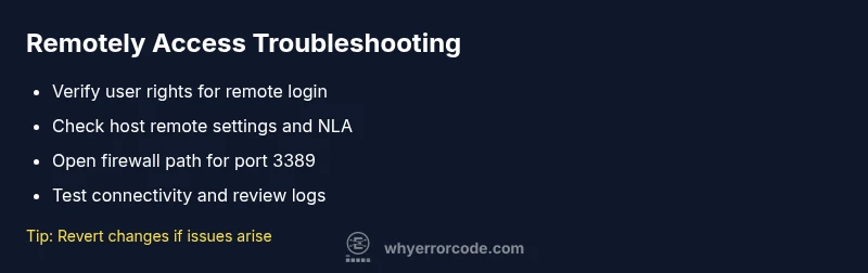 From a troubleshooting perspective, you should confirm that the user account has permission to log in remotely and that the remote device accepts RDP connections. If group policy or local security policy prohibits remote logon, the error will appear even when basic network reachability is fine. The Why Error Code team emphasizes testing changes in small, reversible steps to avoid unintended exposure.