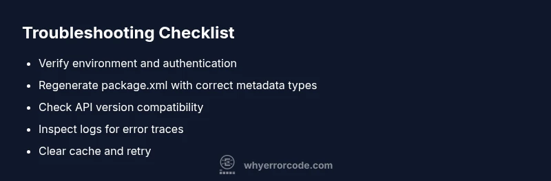 You may encounter messages such as: “Invalid metadata type in package.xml,” “ Unable to fetch Manifest,” or "The package.xml contains an unsupported type." Often, these errors stem from a type not present in the target API, a mismatch between the project’s manifest and the org, or syntax issues in the generator’s inputs. The Why Error Code Team emphasizes how clear error wording helps you isolate whether the problem is input data, environment configuration, or tool state. Use these patterns to guide your next steps and avoid generic troubleshooting loops.