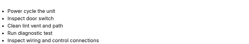 Begin with non-invasive, user-serviceable steps: power cycle the dryer by unplugging for 60 seconds and plugging back in, then reset via the control panel. Inspect the door switch for wear or misalignment and clean the lint trap and vent path to ensure proper airflow. If your model offers a diagnostic test, run it and note any codes displayed. Avoid tapping or forcing components; if the drum still won’t operate after these steps, escalate to the more thorough diagnostic flow or contact a technician. Safety first—do not defeat interlocks or bypass safety features.