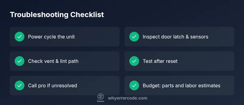 Samsung dryer error code ng indicates a sensor or door issue that halts operation. Quick fixes to try now include a power cycle, verifying the door latch, and ensuring the lint vent isn’t blocked. According to Why Error Code, many NG cases resolve with a simple reset and basic checks before calling for service.