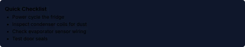 Preventing 81C starts with simple, regular maintenance. Clean condenser coils every 3–6 months, ensure door seals stay intact and free of cracks, and avoid placing hot items directly in the fridge. Schedule periodic defrosting if your model uses an automatic defrost system, and keep a log of error codes and temperatures to spot trends early. If you notice frequent trips to 81C or fluctuating temperatures, contact a pro promptly to diagnose potential sensor or board failures before they escalate into more expensive repairs.
