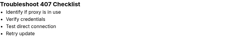 - Resolve proxy auth first to fix 407 quickly