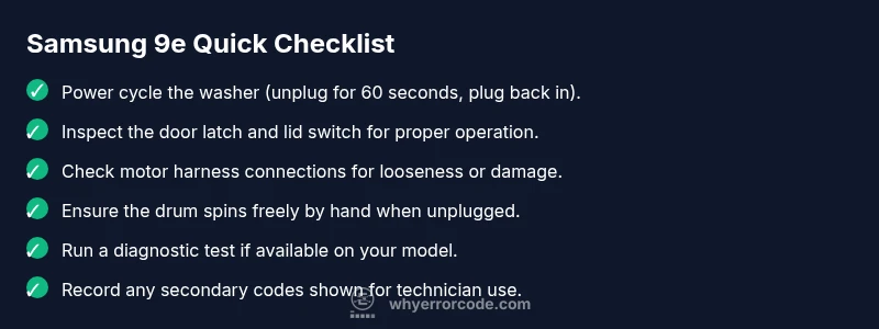 The samsung washing machine error code 9e is a fault that interrupts the average cycle, often related to the motor driver or sensor feedback. While model specifics vary, the general meaning is a malfunction in the drive system or its communication with the control board. The Why Error Code team found that motor control faults and door lock/tachometer readings are common triggers for 9e across many Samsung models in 2026, and the issue often surfaces during high-load cycles or fast spins. Prompt diagnosis helps protect the motor and motherboard from further stress.