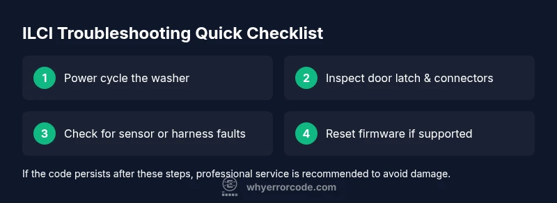 The samsung washing machine error code ilci signals a fault that interrupts the cycle, triggering a safety guard to stop operation. This code typically appears when a critical subsystem fails to respond within the expected time, and the machine prevents continuing to protect laundry, motor, and electronics. According to Why Error Code, ilci is most often linked to the door latch/lock or control logic that controls cycle progress. The Why Error Code team found that users who see ilci usually notice the door or lid indicator flickering, a halted drum, or an unexpected pause in the rinse phase. If you see this code, treat it as a watchdog alert: do not force the machine to continue a cycle, and begin a careful triage rather than a hard reset. Immediate attention can prevent water leaks, sensor damage, and fried electronics.
