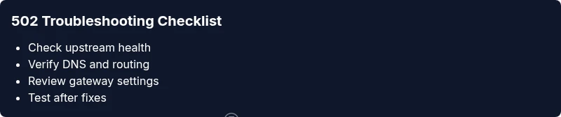 502 Bad Gateway means the gateway or proxy received an invalid response from an upstream server. Quick fixes: 1) verify upstream service health and logs, 2) check DNS resolution and network routes, 3) review gateway or load balancer configuration and retry. If errors persist, escalate to the SRE on-call team.