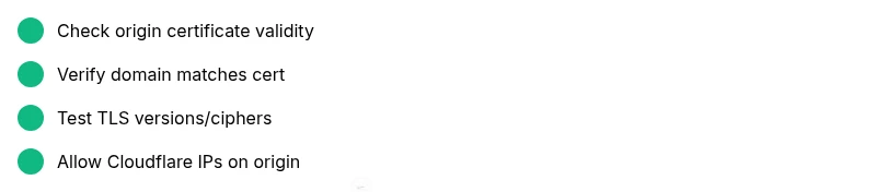 Verify that the origin supports modern TLS versions (1.2+ or 1.3) and a compatible cipher set. Inadequate ciphers or legacy configurations can prevent the handshake from completing.