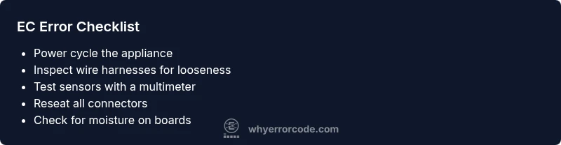 EC stands for communication fault between the control board and a subsystem; you’ll want to check wiring, sensors, and connectors.