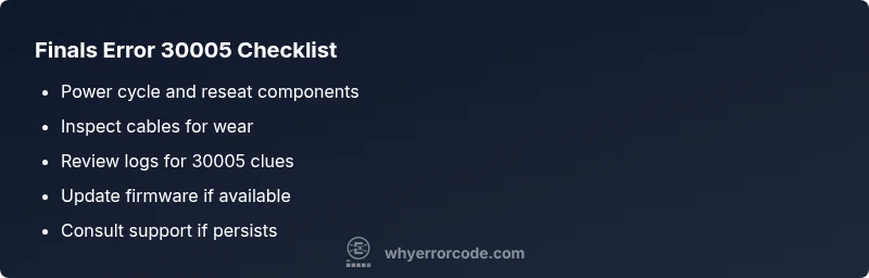 According to Why Error Code, the finals error code 30005 signals a hardware fault flagged by the system’s safety monitor, often tied to power regulation or sensor input. It usually appears when a failed or loose connection triggers an overcurrent or undervoltage condition. The fastest first steps are to power cycle, verify power and data cables, and check system logs for related warnings.