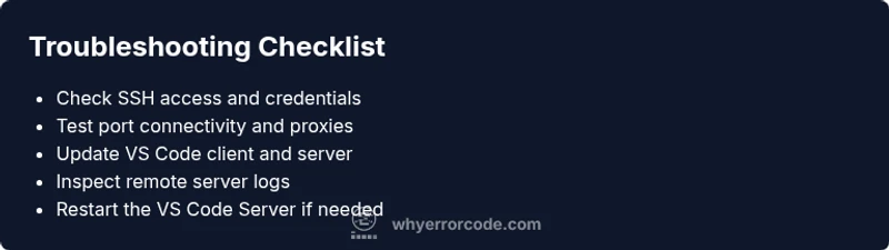 The message "unable to connect to vs code server error in request" usually hides a few core issues: SSH authentication problems or expired keys, a blocked network port by a firewall or proxy, mismatched versions between the VS Code client and the remote server, or problems with container/WSL environments. Misconfigurations in your remote hostname, user, or path to the server can also trigger this error. Understanding these root causes helps you target fixes quickly and reduce downtime, especially for developers working across multiple machines or cloud hosts.